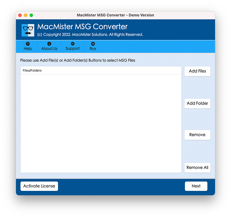 Step 2. Use Add Files and Add Folder and load MSG files which needs to be transferred in required Outlook for Mac account and click Next.
